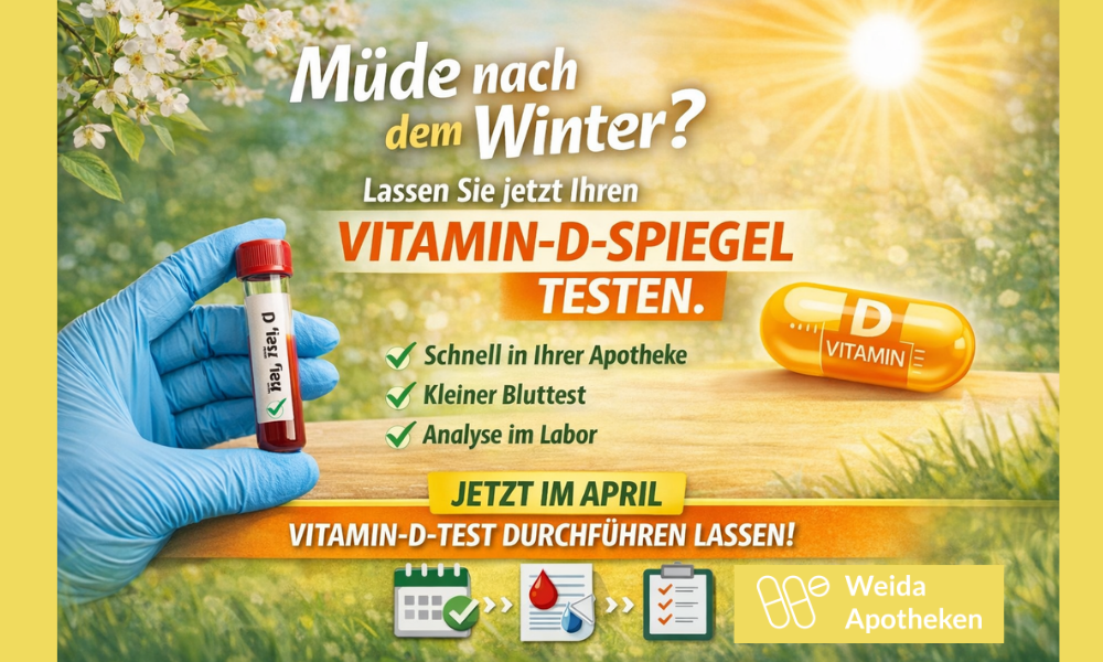 Fühlen Sie sich nach dem Winter oft müde und energielos? Dann nutzen Sie unsere April-Aktion und lassen Sie Ihren Vitamin-D-Spiegel überprüfen – eine wichtige Grundlage für Ihr Wohlbefinden. Unser Apotheken-Team empfiehlt die Kontrolle, um mögliche Defizite frühzeitig zu erkennen und individuell darauf eingehen zu können. Vereinbaren Sie einfach Ihren persönlichen Termin – wir nehmen uns Zeit für Sie und beraten Sie umfassend.